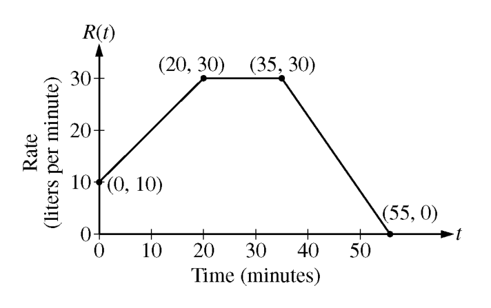 At time \(t = 0\) minutes, a tank contains 100 liters of water. The piecewise-linear graph above shows the rate \(R(t)\), in liters per minute, at which water is pumped into the tank during a 55-minute period.